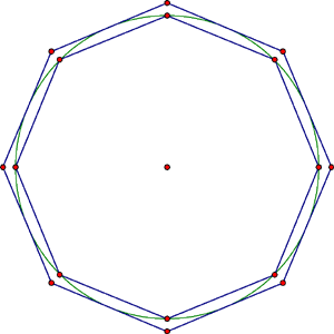 Archimedes was one of those people who wanted to know the exact value of Pi. So at some point he must have thought something on the lines of: "How do you calculate it?" In Ancient Greek that is. So he started looking at perimeter of polygons inscribed in a circle; he calculated the area of a regular polygon with a circle inscribed in it, then the area of a regular polygon inscribed in a circle itself. It looked something like this: