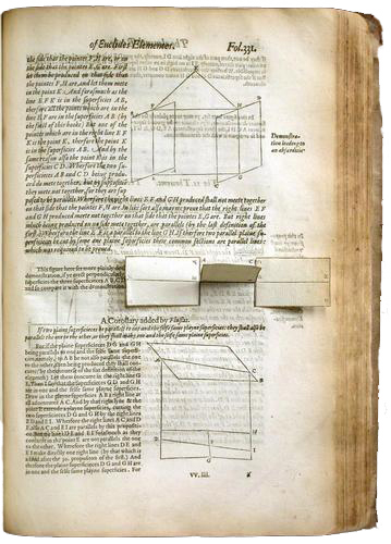 The first English printing of Euclid was by the notorious mathematician and scholar, John Dee, in 1570. This book was designed with pop-ups to show propositions in three dimensions.