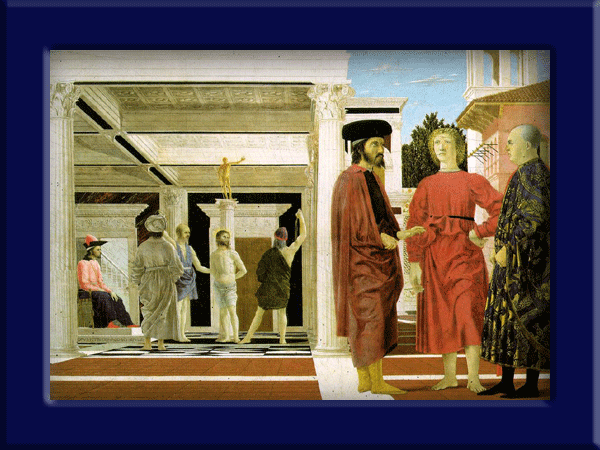 Piero della Francesca's Flagellation of Christ, around 1460. It has an extremely interesting underlyining geometry, as well as the story! Have a look at the figures at the front - they are representatives of the different classes of contemporary Italy; the figure of Mercury (god of communication) sheds light on the ceiling above the youth being punished.