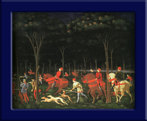 Paolo Uccello's The Hunt in the Forest, painted around 1460. Although you can't actually see the underlyining structure, it is very regular: all the trees and the hunters are placed in regular intervals on the underlyining grid, which also allows for the accurate and quite regular determination of their heights.
