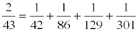 You will notice that no fraction is allowed to appear twice, but is not known how these particular unit fractions were derived. It is evident that there are many possible solutions, but it is not so evident why some solutions would be preferential to others. It is interesting to note that the first section of Rhind Papyrus is a table of the division of 2 by every odd integer from 3 to 101, and it may be that the Egyptian scribes realised that the result of multiplying by 2 is the same as that of dividing 2 by n . In fact, it may be that the decomposition for fractions of the form was the only necessary decomposition since Egyptians used the dyadic multiplication. This means that, instead of using times tables (as we do), they used two operations to multiply, doubling and adding. Click here to find out about dyadic multiplication.