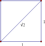 The meaning of the word 'surd' is twofold – in mathematics it refers to a number that is partly rational, partly irrational; in phonetics it refers to sounds uttered without vibration of the vocal cords – and so voiceless, 'breathed'. So if you put the two together, you get that surds are 'mute' or 'voiceless' numbers. This is, actually, not a totally loopy statement: as you may know, certain ratios of numbers give pleasing sounds and have been described as far back as the Pythagoras' time. Pythagoreans were credited with the discovery that the sound produced by an instrument is defined by the ratio between the length of a string which produced it and the (in some way, for example by pressing a finger against the string) shortened length of that string. So for example one speaks of a major third (4:5), or a minor third (5:6) in music, and this has a mathematical description – 4:5 or 5:6. What is important to understand now is the fact that the irrational numbers are also incommensurable with other numbers. Look at the square below: The side of the square is 1, and its diagonal will be
