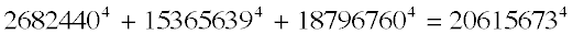 Euler's conjecture is closely related to Fermat's Last theorem. Fermat's Last Theorem states that, although there are tripples such as a, b, c for which it is true to say there are no numbers x, y, and z for which is valid, when n>2. Euler, in 1769 proposed that there are no sets of numbers such that or OR, in general terms, there are any sets of n-1 numbers such that the sum of their n-th power would also be an n-th power. The conjecture was disproved in 1966 by Lander and Parkin who found counterexample for n=5: Another counterexample was found by Noam Elkies in 1988: Another counterexample was given by Roger Frye who found the smallest possible n=4 solution