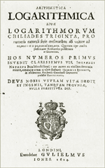Now, the bottom row also represents a geometric series, while the top an arithmetic one. If you take any two numbers in the arithmetic series, and add them up, this would indicate the term in the corresponding geometric series that is the product of the two corresponding terms. Let's see how this works: Take 4 and 6, add them up: 4+6=10. Now look at the corresponding members of the geometric series: for 10 ... 1024 4 ... 16 6 ... 64 If you multiply the corresponding members of the geometric series, you get 16x64=1024 John Napier published for a first time a book Mirifici Logarithmorum Canonis Descriptio, in which he described the method of connecting arithmetic with a geometric series. Click on the picture to get a full-size copy The meaning of the word logarithm is derived from two Greek words - logos - meaning ratio, and arithmos - meaning number. Later on in the same year when Napier's book was published, a London mathematician Henry Briggs (who was a professor of geometry at Gresham College at the time) started working on the same topic. He went to Scotland to work with Napier, and when Napier died in 1617, took over the work on logarithms. He popularised the concept of logarithms and published a modified book of tables in 1624 under the title Arithmetica Logarithmica. Within no more than few decades from this publication, the use of logarithms was spread around the world. They became as popular as calculators in our time, because they offered an easy way of calculation. Click on the picture to get a full-size copy The most common bases of logarithms are 2, e and 10. Briggs called common logarithms those who are based on powers of 10 - we still use the same title. The logarithms with the base e are written as ln and are called natural logarithms.