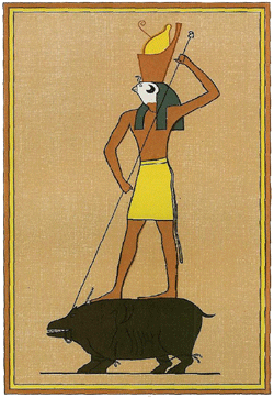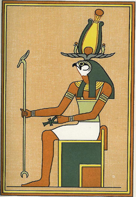Image of Horus Hieroglyphic sign for Horus The main feature of Egyptian mathematics were their fractions. The hieroglyphic symbol for fraction is at the same time the smallest unit for grain and is described by a symbol for ro , depicting an open mouth. Ro is the smallest part of a hekat largest measure for grain. The only fractions of hekat used were 2 4 8 1 6 3 2 and 6 4. The smallest of these fractions, 6 4, contained 5 ro . These fractions were written in a special way, quite unlike ordinary fractions and the symbols when put together, form the Eye of Horus, one of the most well known symbols of ancient Egypt, and were used solely for the measure of grain. Horus was the son of Isis and Osiris, who was conceived after Isis revived Osiris (as he was slain by his brother Seth). Horus is also one of the names of the sun, and had his myths independently from either Ra or Osiris. The myth of Blind Horus describes the victory of Darkness over Light. A legend contained in the 112th chapter of the Book of the Dead describes Horus as wounded in the eye by Seth (or Set) in the form of a black boar. Set swallowed the eye, and was compelled to vomit it from the prison in which he was confined with a chain of steel fastened about his neck. The Eye of Horus is afterwards spoken of as a distinct deity, terrible to the enemies of Light. Image of Horuse slaying Seth, the Force of Darkness According to another version of the legend, Horus' eye is restored to him by Tehuti (or Teth, who is known to be, among other things, a God of Mathematics), who is the Egyptian Hermes. Tehuti is sometimes called also "the measurer of this earth". He is said to have "calculated the heaven and counted the stars", and to have "calculated the earth and counted the things which are in it". Horus role in the Egyptian mythology is also often linked to the rites of the dead, and the gods who prepare and take the deceased to the otherworld. Through the rites performed by priests, the new body of the deceased grew out of the dead body and was called into existence by the ceremonies and words which were recited by the priests on the day when the mummified body was laid in the tomb. The gods nourished themselves with celestial food, which was supplied to them by the Eye of Horus.