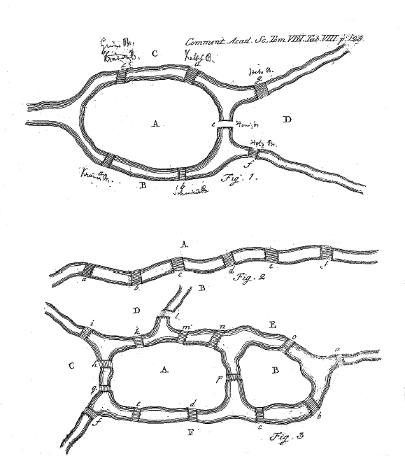 There are several branches of topology which deal with different problems and ideas. The work which is considered to be the first work in topology was Euler's paper on Königsberg bridge sproblem. It was published in 1736 and was entitled Solutio problematis ad geometriam situs pertinentis : translated into English this is The solution of a problem relating to the geometry of position. Königsberg is a town which has a river going through its middle and a number of bridges between the parts of the town. Euler illustrated this as follows The river Pregel divides the town into four sections - A, B, C, and D. There are seven bridges, and some of the town's citizens apparently wondered whether they can walk across all seven bridges without crossing any bridge more than once. Euler in his paper explained that such a journey was impossible by studying the network of bridges. He concluded that, if a journey would begin at one land mass and end at another, than these two could have an odd number of connecting bridges, while each other land mass should have an even number of bridges connected to it otherwise the journey is not possible. Try to draw a diagram which represents Königsberg's bridges problem by representing land masses by points and bridges by lines that connect them. You are now using one kind of topological diagram which is called "planar graph". Try to cross the bridges only once but to cover each bridge and to arrive at all land masses. The problem is to draw this picture without going over any line twice, and not lifting your pencil from the paper. If you look carefully, you will see that all four vertices (points) in the picture above have an odd number of lines which connect them (these are by the way called arcs). Every vertex with an odd number of arcs attached to it has to be either at the end or the beginning of the pencil path. Try to prove or disprove this! Because your 'journey' has to start and finish, the vertices with odd number of paths have to be either at the beginning or an end of your journey. Euler generalised this thinking into a number of definitions followed by a theorem: Definition 1: A network is a figure made up of vertices (points) connected by non-intersecting arcs (curves, lines that connect the vertices). Definition 2: A vertex is called odd if it has an odd number of arcs leading to it, otherwise it is an even vertex. Definition 3: An Euler path is a continuous path that passes through every arc once and only once. Theorem: If a network has two or less odd vertices, it has at least one Euler path. Try to draw networks which satisfy or not the theorem above. Then don't be lazy - send me some nice solutions so that they can be included here!